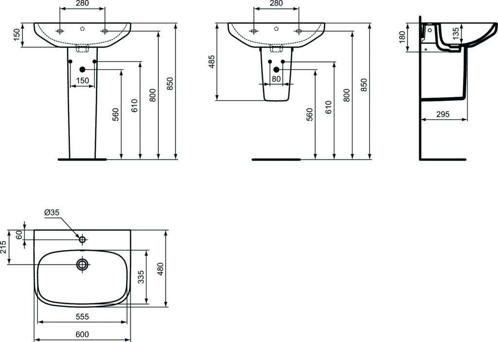 - For assembly with pedestal T4712 or semi-pedestal T4713, or alone with siphon.